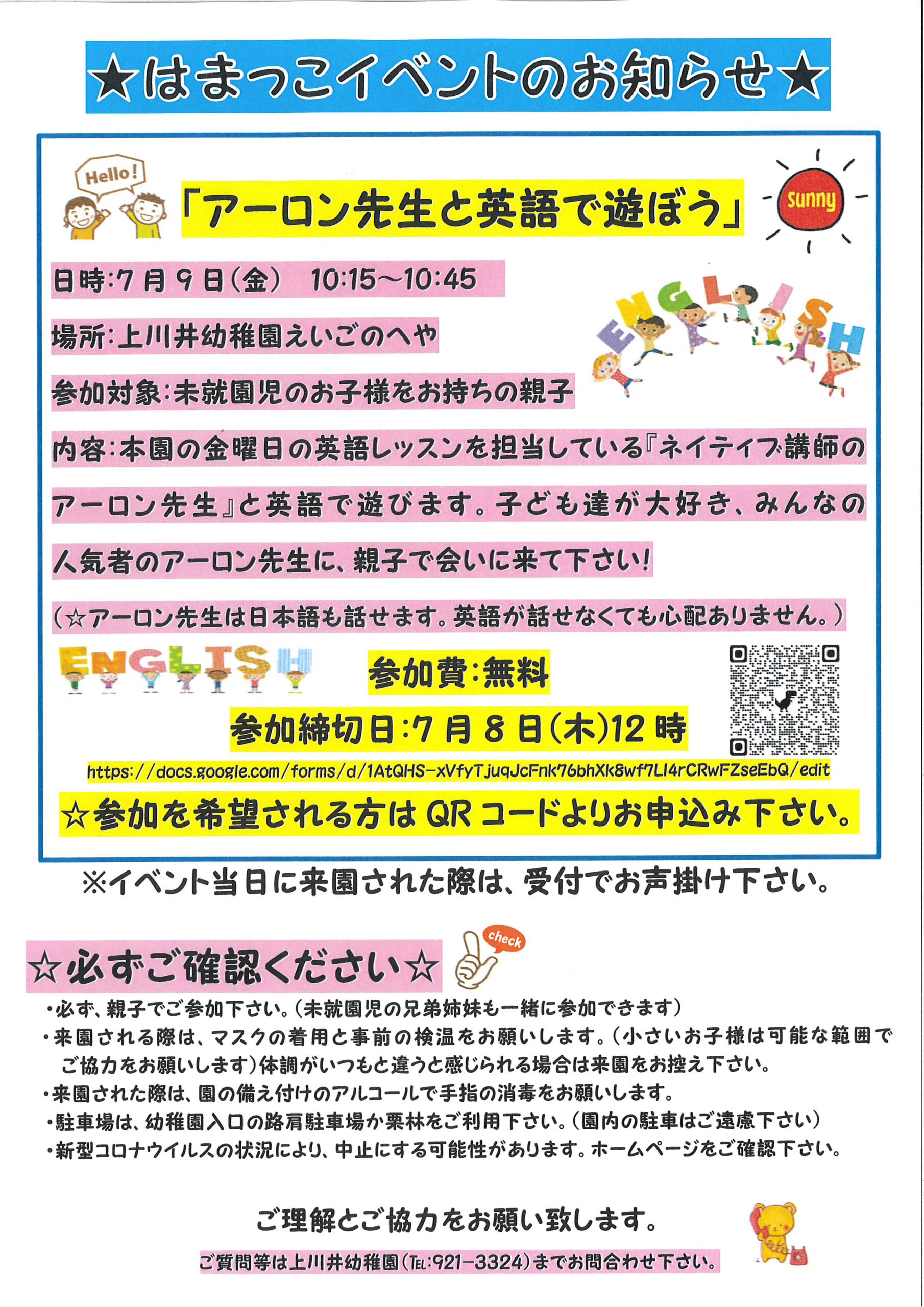 未就園児対象のはまっこイベント『アーロン先生と英語で遊ぼう』を開催します。