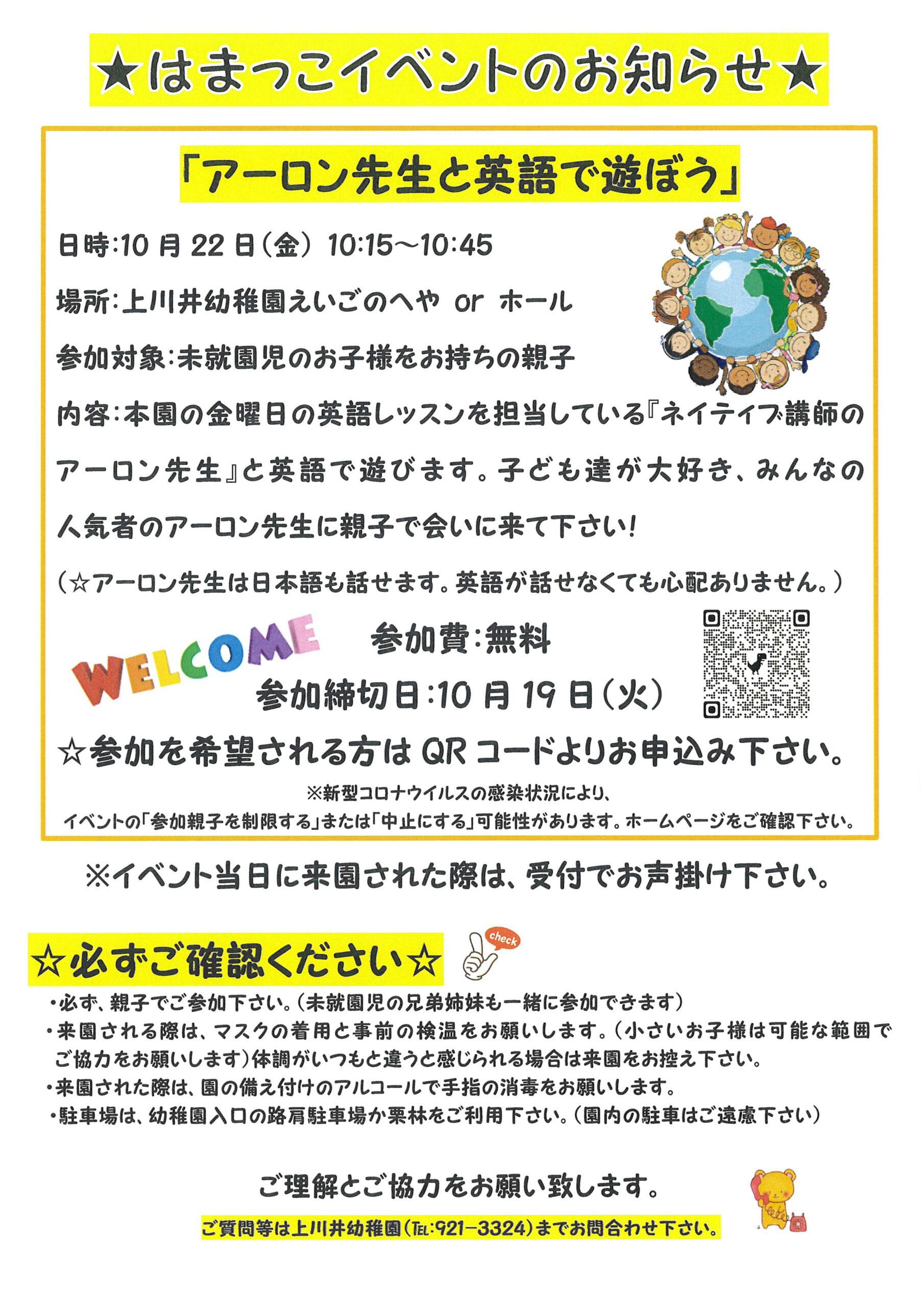 幼稚園・保育園上川井幼稚園の幼稚園ニュースです。 お電話でのお問い合わせ045-921-3324 教育実習・ボランティアスタッフ等もこちらからお問い合わせください。 上川井幼稚園について 入園案内 幼稚園ニュース 園内マップ 採用情報 045-921-3324 お問い合わせ news幼稚園ニュース HOME 幼稚園ニュース イベント 10月22日(金) <アーロン先生と英語で遊ぼう> 受付しています! 2021.10.1810月22日(金) <アーロン先生と英語で遊ぼう> 受付しています! 未就園児対象のはまっ子イベント『アーロン先生と英語で遊ぼう』を開催します。 日時:10月22日(金) 10:15~10:45 場所:上川井幼稚園えいごのへや 参加対象:未就学児のお子様をお持ちの親子 申込方法:QRコードよりお申込み下さい 参加費用:無料 ぜひ、親子で遊びに来て下さい! « 前へイベント一覧へ戻る 次へ »
