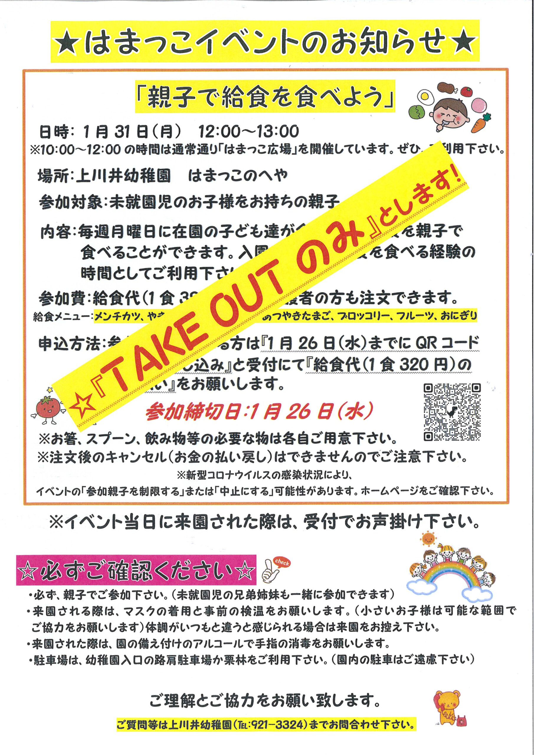 1月31日(月)に予定をしております、はまっこイベント『親子で給食を食べよう』ですが、令和4年1月21日~2月13日までの間、政府より「まん延防止等重点措置」が適用された関係で、給食を幼稚園で食べるのではなく、ご家庭で食べて頂く『テイクアウトのみ』に内容を変更して実施致します。