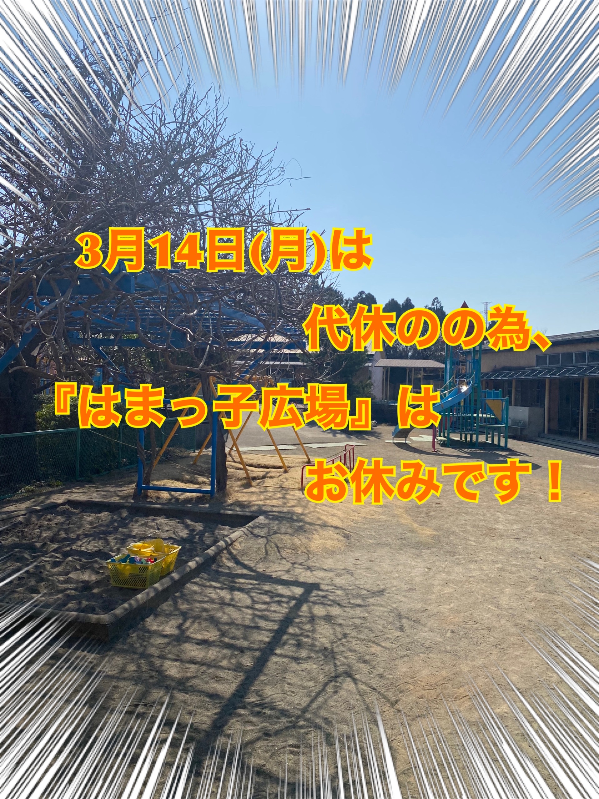 3月14日(月)は卒園式の代休の為、はまっ子広場はおやすみします。
