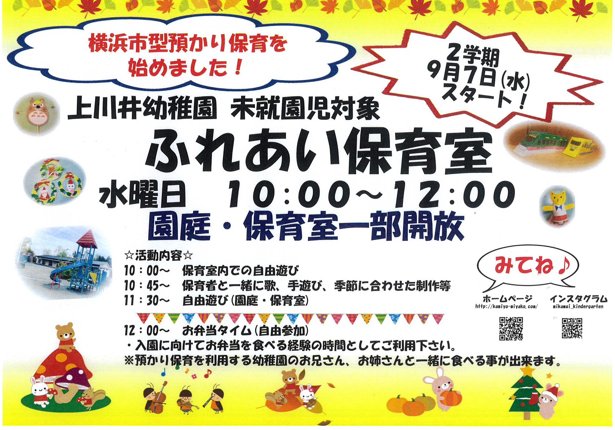 幼稚園・保育園上川井幼稚園の幼稚園ニュースです。 お電話でのお問い合わせ045-921-3324 教育実習・ボランティアスタッフ等もこちらからお問い合わせください。 上川井幼稚園について 入園案内 幼稚園ニュース 園内マップ 採用情報 045-921-3324 お問い合わせ news幼稚園ニュース HOME 幼稚園ニュース お知らせ 2学期の『ふれあい保育室』は9月7日(水)スタート! 2022.08.242学期の『ふれあい保育室』は9月7日(水)スタート! 令和4年度2学期の未就園児対象の『ふれあい保育室』は9月7日(水)よりスタートします。ぜひ、親子で遊びにいらしてく下さい。 お待ちしています! ※はまっ子広場は開催しています。こちらもご利用下さい。 « 前へお知らせ一覧へ戻る 次へ »