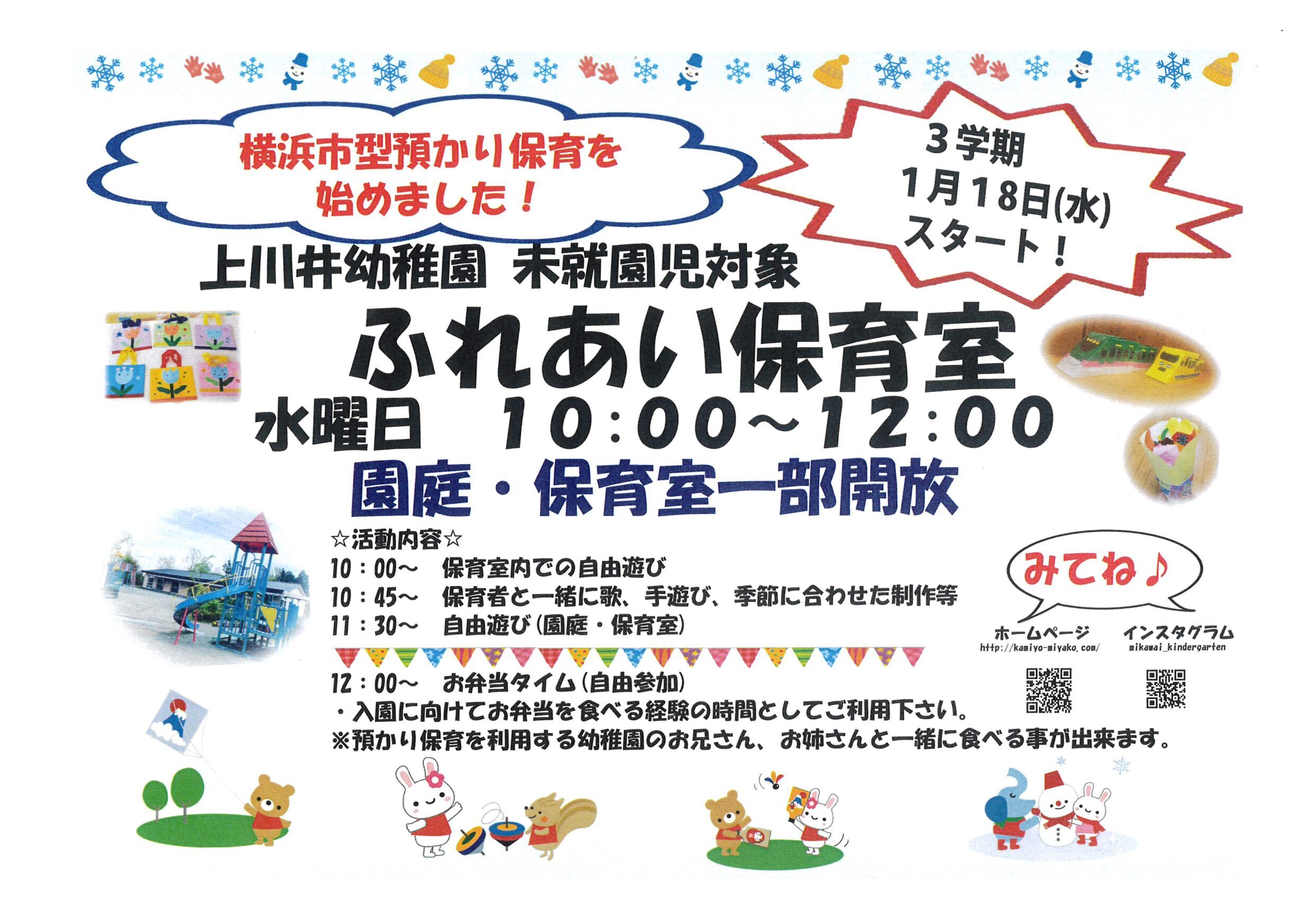 幼稚園・保育園上川井幼稚園の幼稚園ニュースです。 お電話でのお問い合わせ045-921-3324 教育実習・ボランティアスタッフ等もこちらからお問い合わせください。 上川井幼稚園について 入園案内 幼稚園ニュース 園内マップ 採用情報 045-921-3324 お問い合わせ news幼稚園ニュース HOME 幼稚園ニュース お知らせ 3学期の『ふれあい保育室』は1月18日(水)スタート! 2022.12.103学期の『ふれあい保育室』は1月18日(水)スタート! 令和4年度3学期の未就園児対象の『ふれあい保育室』は1月18日(水)よりスタートします。ぜひ、親子で遊びにいらしてく下さい。お待ちしています! ※はまっ子広場は開催しています。こちらもご利用下さい。 « 前へお知らせ一覧へ戻る 次へ »
