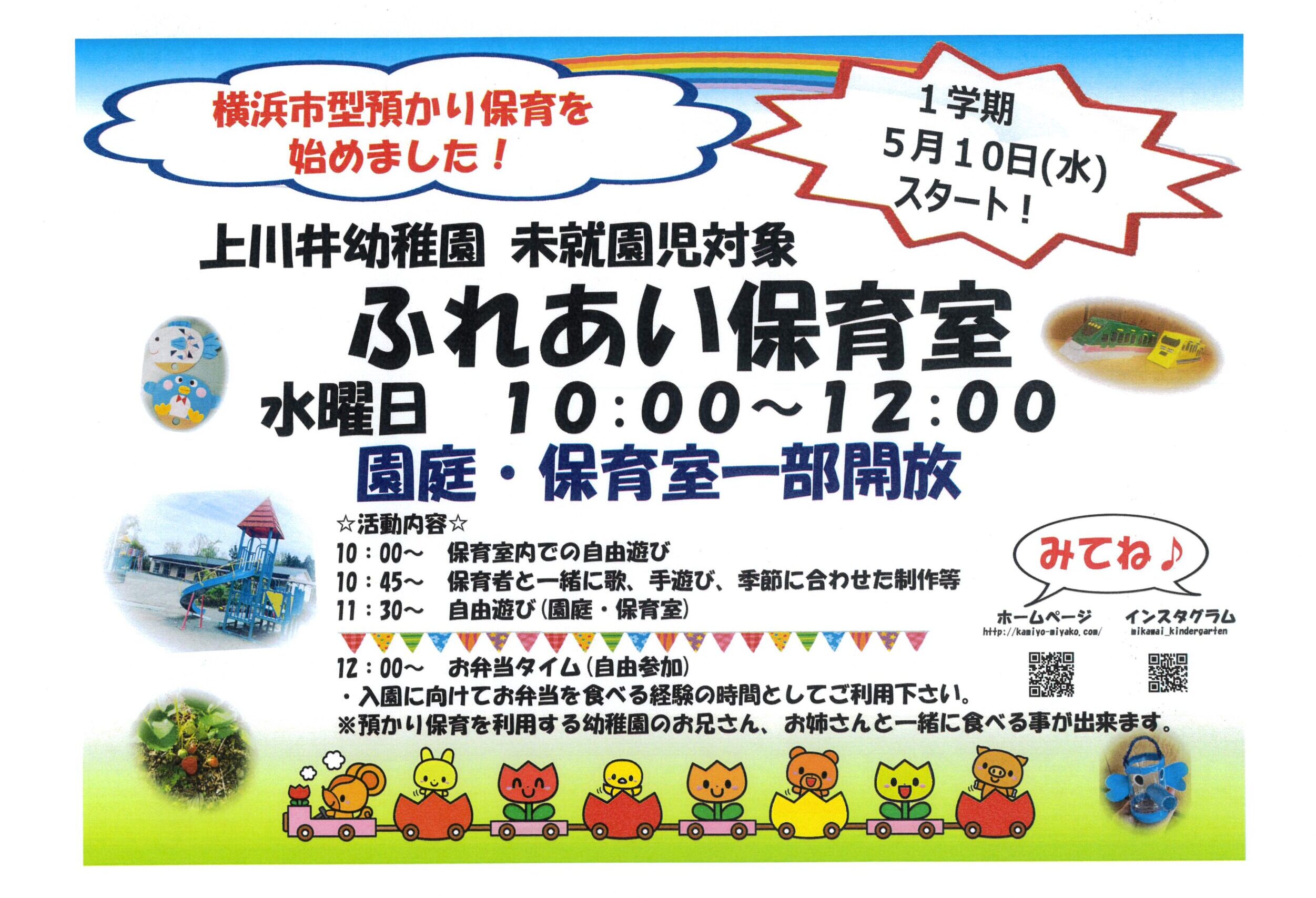 令和5年度1学期の未就園児対象の『ふれあい保育室』は5月10日(水)よりスタートします。ぜひ、親子で遊びにいらしてく下さい。お待ちしています!