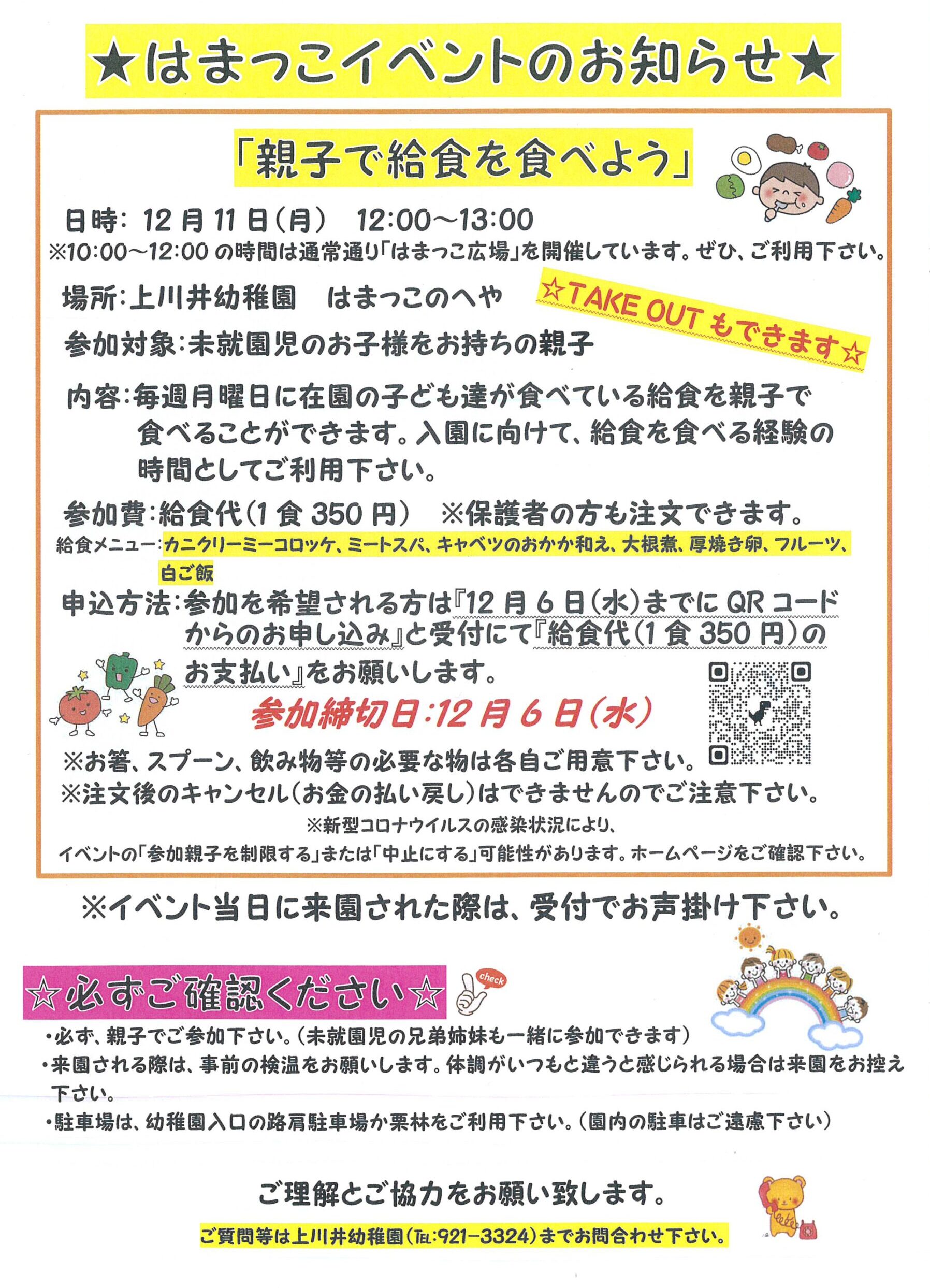 ・参加を希望される方は、12月6日(水)まで『QRコードからのお申込み』と受付にて『給食代の支払い』をお願いします。