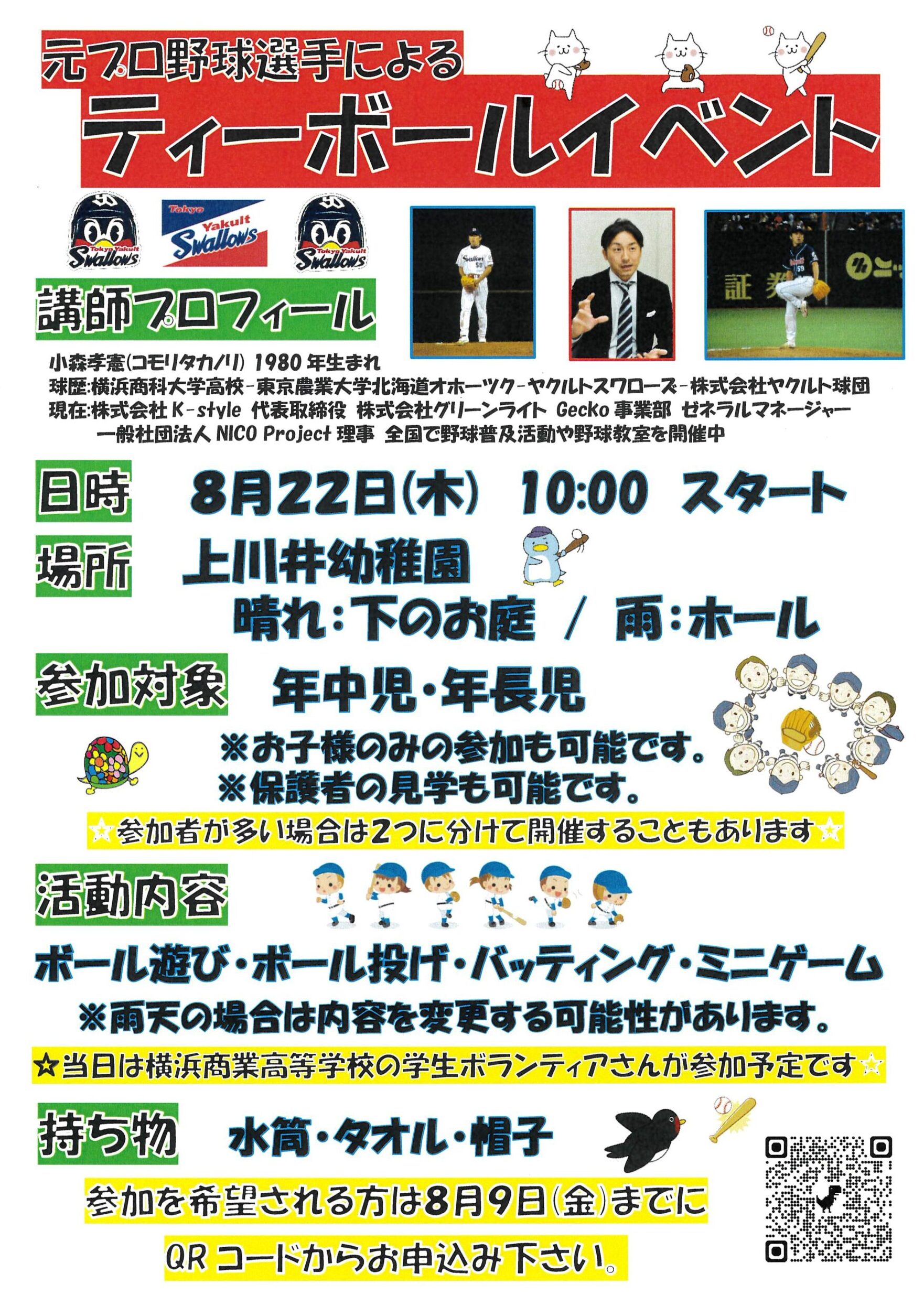 幼稚園・保育園上川井幼稚園の幼稚園ニュースです。 お電話でのお問い合わせ045-921-3324 教育実習・ボランティアスタッフ等もこちらからお問い合わせください。 上川井幼稚園について 入園案内 幼稚園ニュース 園内マップ 採用情報 045-921-3324 お問い合わせ news幼稚園ニュース HOME 幼稚園ニュース お知らせ ⚾️上川井幼稚園のお子様限定イベントのお知らせ⚾️ 2024.07.28⚾️上川井幼稚園のお子様限定イベントのお知らせ⚾️ ⚾️上川井幼稚園のお子様限定イベントのお知らせ⚾️ 『元プロ野球選手によるティーボールイベント』を開催すます😄 お子様のみの参加もOK👍 ※当日は横浜商業高等学校の学生ボランティアさんが参加予定です😆 « 前へお知らせ一覧へ戻る 次へ »
