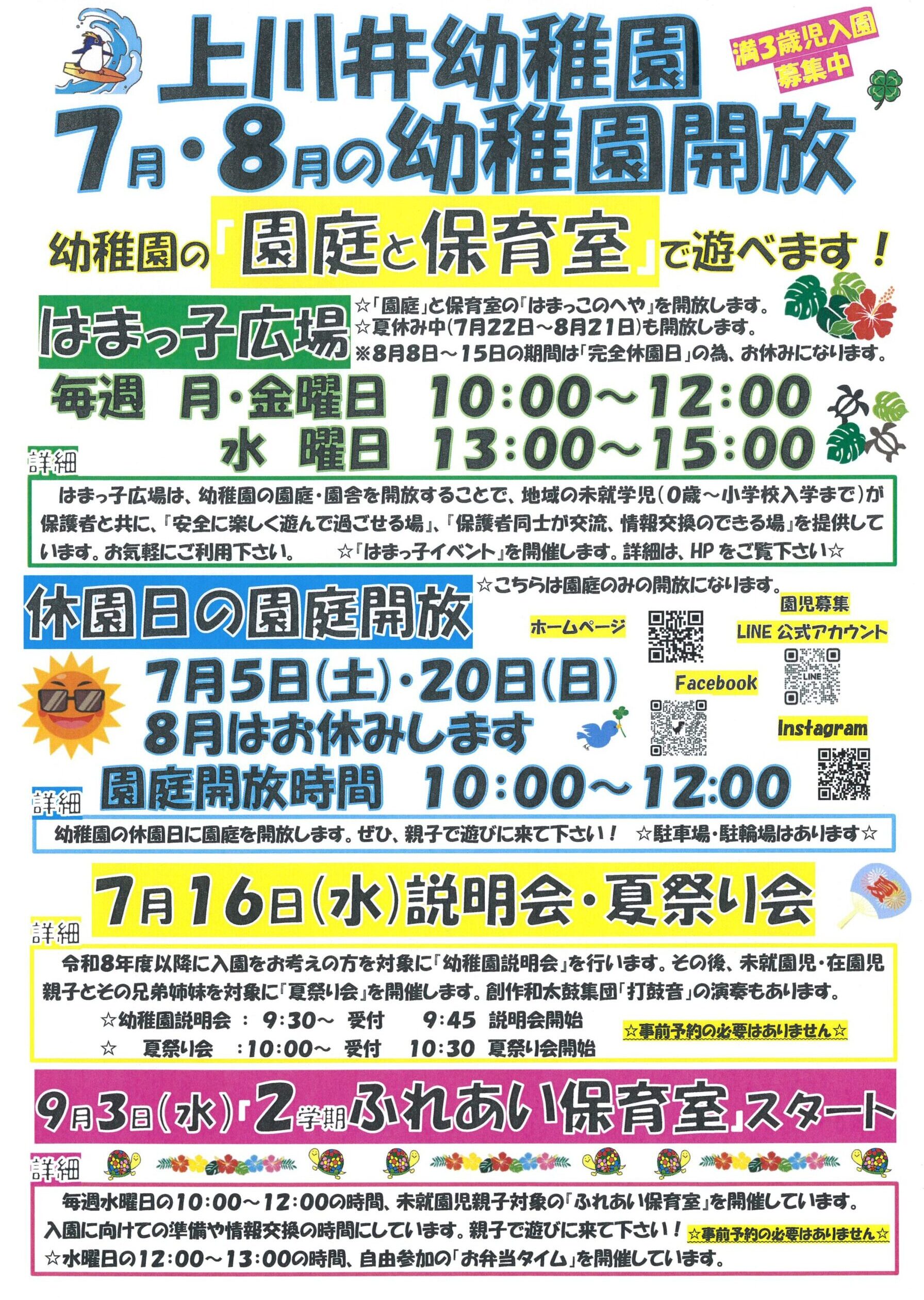 7月も幼稚園を開放します。自然いっぱいの幼稚園に親子で遊びに来て下さい!