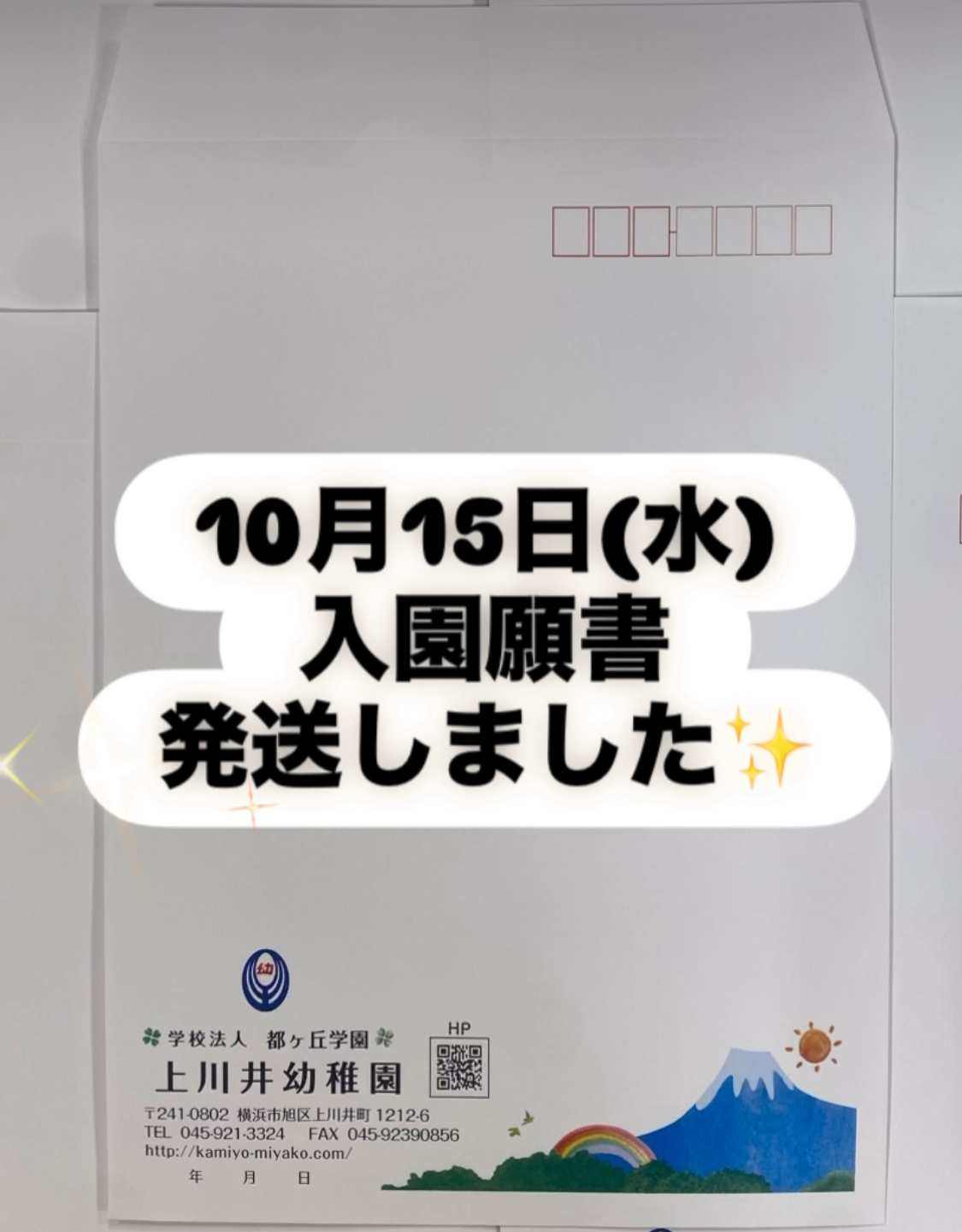 幼稚園・保育園上川井幼稚園の幼稚園ニュースです。 お電話でのお問い合わせ045-921-3324 教育実習・ボランティアスタッフ等もこちらからお問い合わせください。 上川井幼稚園について 入園案内 幼稚園ニュース 園内マップ 採用情報 045-921-3324 お問い合わせ news幼稚園ニュース HOME 幼稚園ニュース お知らせ 入園願書発送完了! 2025.10.15入園願書発送完了! 10月15日(水)令和8年度入園対象のお子様に入園願書を発送しました✨ たくさんのお友達の入園をお待ちしています😄 入園願書は、 幼稚園説明会にいらしてくれた方、ふれあい保育室・はまっこ広場に遊びに来られた方、園にお問い合わせ下さった方にお送りしています✨ ※10月20日(月)まで届かない場合や入園願書の郵送を希望される方は幼稚園までお電話下さい☎️ お知らせ一覧へ戻る 次へ »