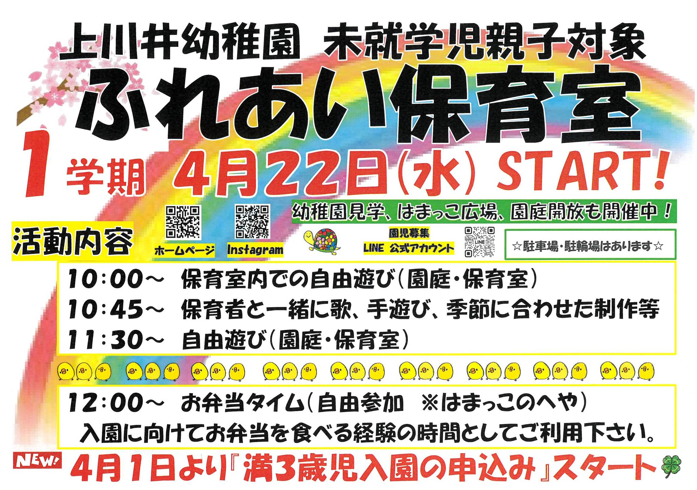 幼稚園・保育園上川井幼稚園の幼稚園ニュースです。 お電話でのお問い合わせ045-921-3324 教育実習・ボランティアスタッフ等もこちらからお問い合わせください。 上川井幼稚園について 入園案内 幼稚園ニュース 園内マップ 採用情報 045-921-3324 お問い合わせ news幼稚園ニュース HOME 幼稚園ニュース お知らせ 令和8年度の『ふれあい保育室』は4月22日(水)スタート🎉 2026.03.26令和8年度の『ふれあい保育室』は4月22日(水)スタート🎉 令和8年度1学期の未就園児対象の『ふれあい保育室』は4月22日(水)よりスタートします。ぜひ、親子で気軽に遊びにいらしてく下さい。お待ちしています! ※はまっ子広場を月・金曜日10:00~12:00、水曜日13:00~15:00の時間で開催しています。こちらも、遊びにいらして下さい。 « 前へお知らせ一覧へ戻る 次へ »